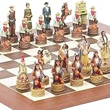 Hand painted chessmen crafted from solid marble resin with felted bottoms. Each piece impressively depicts the characters of the untamed western frontier, Imported from the Orient. The Chess board is made of maple and walnut from Spain. King Height: 3 1/8"Chess Board Squares: 1 9/16"