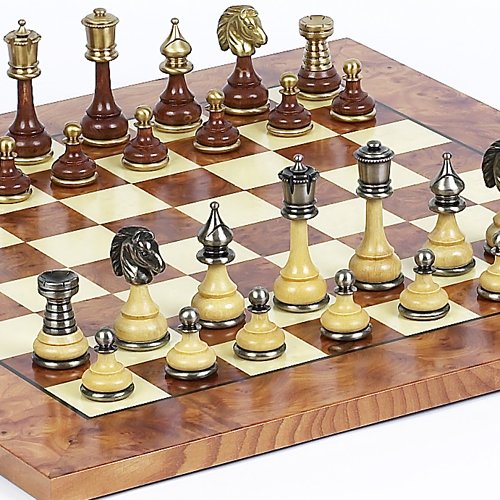 This is an exceptional set of chessmen crafted by Italian artisans in Italy. This set will become the centerpiece of any room. The pieces are solid brass/silver plated with maple/walnut in between, the pieces are referred to as "satin brass" meaning the pieces are spun ever so gently so they have the look and feel of satin. The chess board is crafted of elm, root, birdseye maple and briarwood from Italy there is a striking black onyx color trim around the boarder of the squares. This is a beautiful chess set to leave on display just as one would display a fine piece of crystal.King height: 3 1/2".Base diameter: 1 1/4".Heavy in weight with felted bottoms.Solid Brass/Silver plated chessmen.Chess board squares: 2". Thickness: 1/2"