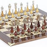 This chessmen set exemplifies luxury! This is an exceptional set of chessmen crafted by Italian artisans in Italy. This set will become the centerpiece of any room. The pieces are solid brass plated with 24K gold/silver with maple/walnut in between. The chess board is crafted of maple/walnut from Spain with a high gloss finish. This is a beautiful chess set to leave out on display just as one would leave out a fine piece of crystal.King height: 4".Base diameter: 1 1/8".Heavy in weight with felted bottoms.24K gold/silver plated over solid brass.Chess board squares: 2". Thickness: 1/2"